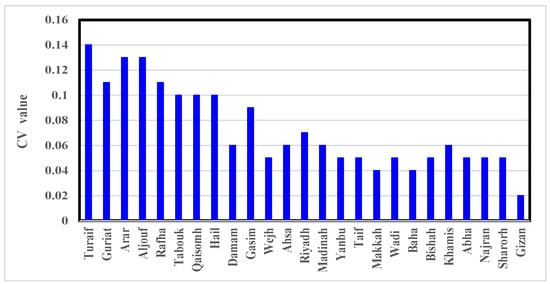 The coefficient of variation of Winter Air Temperatures for Saudi Arabia stations. The stations are arranged from north to south.