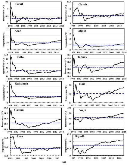 The CSM technique has a smoothing effect and is used here to show the persistence or the fluctuations (decadal and inter-decadal) in the behavior of the WAT time series of SA stations. Figure 4a,b show the behavior of temperature values of each station. The results of CSM for Turaif station illustrate that there are two periods of lower temperatures than its CSM average. The first one is from 1983 to 1987 while the second period is from 1992 to 2002. The last period (2002–2015) shows a fluctuation of WAT values around the CSM average. Guriat has lower temperatures than its CSM average for the period 1992–2010. Two periods of higher WAT values occur throughout the behavior of the CSM of Guriat. The first one is from 1985 to 1992, while the second period is from 2010 to 2018. The CSMs for Arar and Aljouf show similar behavior during the period of study. They indicate lower WAT values than its CSM average from 1983 to 2011, followed by a higher value in WAT up to 2018. The average CSMs of these stations (Arar and Aljouf) are approximately 9.9 and 10.9 °C, respectively. Lower WAT values than its CSM average are found in Tabouk for the period 1982–1986 and from 1991 to 2007, followed by continuous higher values until 2018. The CSMs for Rafha and Qaisumah show similar behavior during the period of study. They indicate higher values in WAT from 1978 to 1983, followed by permanent lower values in WAT till 2013.