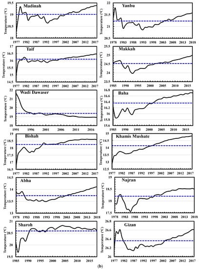 Results obtained from Riyadh, Madinah, and Yanbu stations confirm that the CSM time series can be split into two periods. The first period illustrates lower WAT values, while the second one shows higher values in WAT than the average of CSMs. For Riyadh, the first extends from 1985 to 1999, and for Madinah and Yanbu, it is from 1983 to 2003 and 2005, respectively. Throughout the period 1985–1991, higher WAT values than the CSM average were the constant features at Ahsa. This period was followed by lower values until 2012. Results from Wejh station show that the CSM time series can be split into two periods. The first one (1978–1999) illustrates lower WAT values than the CSM average, while the second one shows higher WAT values (1999–2018). The lower values in WAT than the CSM average are the permanent features throughout the period from 1977 to 2001 in Taif, while the higher values are the permanent features from 2002 to the end of the record. This period was followed by higher WAT values until the end of the record. Results for Baha station confirm that there was a lower temperature from 1985 to 2001 than the CSM average and higher values from 2002 to the end of the record. Bishah and Khamis Mushate stations have the same behavior where the first period is characterized by lower values up to 1997, while the last period is characterized by higher WAT values than the CSM average. Except for 1985–1989, lower WAT values than the average have been detected in Makkah for the period 1985–2003, followed by higher values afterward. Except for 1978 to 1982, lower values of WAT than the average have been detected at Abha for the period from 1978 to 2003, and higher values from 2004 to 2018. During the period 1978–1998, Najran station had significantly lower WAT values than the CSM average, with higher values from 1999 to 2018. The Sharorh station experienced lower values in temperature during the first period from 1985 to 1991, followed by higher WAT values afterward. This station’s CSM average temperature is 20.59 °C.