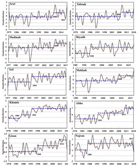 Figure 5 shows the M-W test findings for sudden changes in the standardized WAT time series for the 10 selected stations across SA at a 95% confidence level. The test identified two increasing abrupt changes in the WAT time series of Arar station, the first occurring in 2008 and the second appearing around 2017. The years of abnormal decrease between 2009 and 2018 are 1983, 1989, 1992, and 1993, while the highest temperature appeared in 2010 and was higher than the average of the whole period by 3.2 °C. The WAT of Madinah (Tabouk) in 2009 shows an increasing abrupt change, according to the results of the M-W test (Figure 5). There are two periods in Madinah (Tabouk). The first is from 1977 to 2008, in which the average WAT is 0.27 (0.3) °C lower than the average of the whole period. The second one is from 2010 to 2018, in which the average WAT is 0.98 °C and 1.08 °C higher than the average of the whole period. The Mann–Whitney test of Riyadh (Taif) detected an increasing abrupt change in WAT about 1993 (Figure 5); it also shows two obvious periods in the past 34 (42) years. The first period is from 1985 to 1992, in which the average WAT is 0.93 (0.6) °C lower than the average of the whole period. The second is the higher period from 1994 to 2018, in which the WAT is 0.33 (0.41) °C higher than the average of the whole period. Figure 5 also shows that the M-W test identified an increasing abrupt change in the WAT time series of Makkah in 2008. Moreover, there are two periods. The first is the lower period from 1985 to 2007, in which the average WAT is 0.3 °C lower than the average of the whole period and the abnormal decrease years are 1989, 1990, 1992 and 1993 respectively. The second period is from 2009 to 2018, in which the mean WAT is 1.02 °C higher than the average of the whole period, and the highest temperature recorded was 1.9 °C above the average in 2010. The M-W test identified two increasing abrupt changes in the WAT of Khamis Mushate; the first one was found in 1986, while the second one was found in 1993 (Figure 5). The first lower period of WAT is 1977–1986, in which the mean WAT is 1.2 °C lower than the average of the whole period. The second lower period of WAT is 1987–1993, in which the mean WAT is 0.49 °C lower than the average of the whole period. The higher period of WAT is from 1994 to 2018, in which the mean WAT is 0.62 °C higher than the average of the whole period. The M-W test identified two increasing abrupt changes in the WAT of Abha; the first one is around 1993, while the second one is around 2011 (Figure 5). The lower period of WAT is 1978–1993, in which the mean WAT is 0.61°C lower than the average of the whole period. The first higher period of WAT is 1994–2011, in which the mean WAT is 0.2 °C higher than the average of the whole period. The second higher period of WAT is 2012–2018, in which the mean WAT is 0.9 °C above the average of the whole period. The W-M test determined two increasing abrupt changes in the WAT time series of Gizan; the first one is around 1998, while the second one is around 2013. Figure 5 illustrates that there are three obvious periods, the lower period of WAT is 1977–1997, in which the mean WAT is 0.37 °C lower than the average of the whole period. The first higher period of WAT is 1998–2012, in which the mean WAT is 0.22 °C higher than the average of the whole period. The second higher period of WAT is 2013–2018, in which the mean WAT is 0.75 °C higher than the average of the whole period.