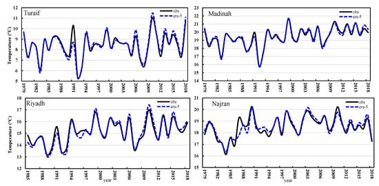 The comparison between ERA-5 Winter Air Temperatures data and its corresponding observed data for the stations Turaif, Madinah, Riyadh, and Najran.