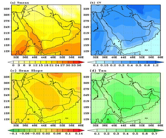 The horizontal distribution of (a) Tmean, (b) coefficient of variation, (c) trend magnitude (Sen’s slope °C/year), and (d) Kendall’s Tau of Winter Air Temperatures during (1959–2022) over Saudi Arabia.