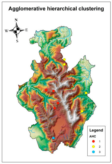 Agglomerative hierarchical clustering was crucial in order to be able to identify the associations between different weather stations regarding snow depths over the period 2010–2022. In this first analysis, it is interesting to note that only the closest weather stations are similar to each other, especially those that occupy the same slopes. This is clear evidence of the influence of topography on local atmospheric dynamics (Figure 2). Daily ground snow data were used to evaluate agglomerative hierarchical clustering in order to identify whether there may be clusters of weather stations that show similar trends in ground snow cover and consequently are exposed to the same atmospheric dynamics. The first group includes Forca di Gualdo, Monte Bicco, Monte Bove, and Monte Prata, while the second group includes Colle, La Valletta, Parco Guarnieri, Pintura di Bolognola, and Sassotetto, while Rifugio Perugia is the only weather station facing the Tyrrhenian slope in its own group (Figure 2).