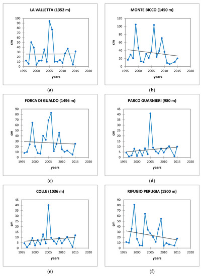 Trend of maximum annual snow depths from 1991 to 2020; the trend line is in black, for the weather stations: (a) La Valletta, (b) Monte Bicco, (c) Forca di Gualdo, (d) Parco Guarnieri, (e) Colle, (f) Rifugio Perugia.