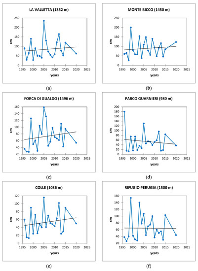 Trend of average annual snow depths from 1991 to 2020, in black the trend line, for the weather stations: (a) La Valletta, (b) Monte Bicco, (c) Forca di Gualdo, (d) Parco Guarnieri, (e) Colle, (f) Rifugio Perugia.