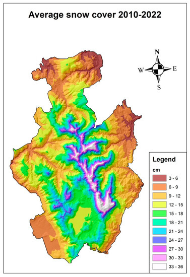 The final goal of this research is to obtain an annual mapping of the study area from 2010 to 2022 for the average snow depth, maximum snow depth, and days with snow on the ground. The interpolation of the territory of the Monti Sibillini National Park could help to quantify snowfall; however, due to the number of weather stations available, it was only possible to perform the interpolation for the period 2010–2022. Thus, data from 10 weather stations were used for the three variables of interest, and as far as the average snow cover was concerned, values from 3 cm up to 36 cm were achieved in the most surveyed parts of the territory (Figure 6).