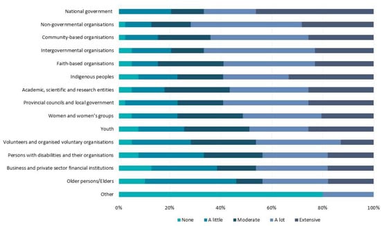 Respondents were asked to rate 15 groups of stakeholders and other bodies (on a scale of 1 = none, to 5 = extensive) that currently have a role in responding to, or helping people work through, NELD caused by climate change in the Pacific region (see Figure 1). The three most favourable groups of stakeholders involved in addressing NELD were as follows: the national government (mean = 3.92), non-governmental organisations (mean = 3.85) and community-based organisations (mean = 3.72). The three least favoured stakeholder groups were as follows: older persons (mean = 3.05), businesses and the private sector (mean = 3.13) and people with disabilities (mean = 3.21).