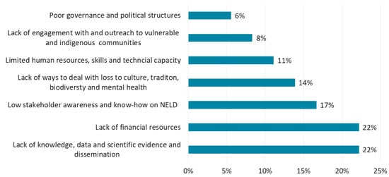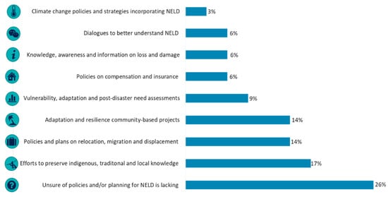 Respondents identified that, while climate change and DRR policies are in place, policies fall short in terms of anticipating, planning for and responding to NELD due to deficiencies in the following areas: knowledge, data and science (22%), financial resources (22%), low stakeholder awareness of NELD (17%), and a lack of ways to deal with the loss of culture, tradition, biodiversity and mental and emotional wellbeing (14%). Many respondents added that, without any standardised methodologies and monitoring frameworks to measure non-economic losses, including indicators, the assessment of NELD and its ability to inform climate and disaster policies remains a challenge.