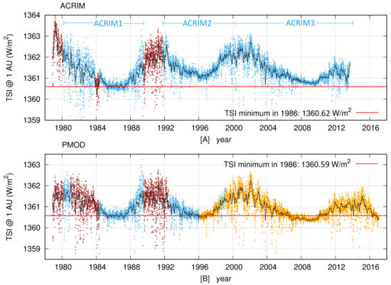 (A) ACRIM TSI satellite composite [63,68]. (B) PMOD TSI satellite composite [64]. ACRIM 1, 2, and 3 (cyan); Nimbus7/ERB (brown); and TIM-SORCE (orange).