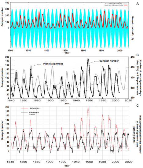 (A) The Venus–Earth–Jupiter model, Equation (3), plotted against the average annual number of sunspots from 1700 to 2021. (B) Hung [76]’s model. (C) Tattersall [82]’s model. From Scafetta [84].