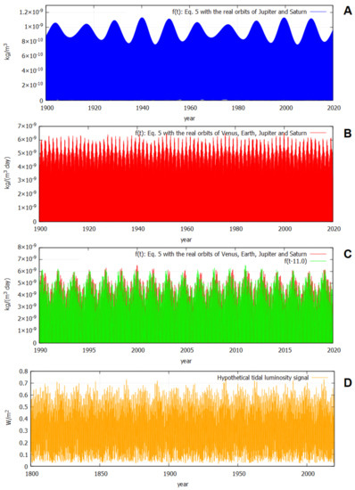 Figure 4A depicts the function (Equation (5)) with only Jupiter and Saturn as inputs. A quasi-11.86-year oscillation is observed, which is tied to Jupiter’s orbital period, because its distance from the Sun varies between the aphelion and the perihelion. Yet, the year neap–spring tidal cycle between Jupiter and Saturn also influences such oscillations. As a result, at the decadal timeframe, the tidal signal is clearly defined by two cycles with durations of 9.93 and 11.86 years, with an average length of close to 11 years. The figure also shows a clear beat with a period of about 60 years, whose maxima occurred in 1940–1950 and 2000–2010, which correspond to the maxima of a quasi- 60-year oscillation observed in global surface temperature and other climatic records [37,85]. Figure 4B uses Wolf [27]’s planetary quartet to illustrate the function using Venus, Earth, Jupiter, and Saturn. The synthetic data clearly show the same 10–12-year oscillation. Once again, Figure 4C demonstrates that the patterns of quick tidal changes recur every 11 years. Figure 4D shows the hypothetical brightness signal produced by all planetary tides estimated by Scafetta [74] using Equation (6).