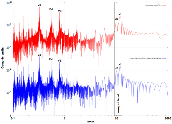 The two power spectra share a number of harmonics, particularly the planets’ neap–spring tides. The power spectrum clearly increases between 9 and 13 years because of the clustering of the 9.93-year neap–spring tidal cycle between Jupiter and Saturn and the 11.86-year tidal oscillation associated with the elliptic orbit of Jupiter. The neap–spring Jupiter–Saturn tidal oscillation is approximately three times smaller than Jupiter’s orbital tidal cycle, which allows the two tidal cycles to produce complex beats. The measured Schwabe cycle spectral band fits the two tidal cycles well. As a result, using the real orbits of Jupiter and Saturn is critical for appropriately connecting the planetary tidal power spectrum to the 11-year sunspot cycle. The result clearly refutes the assertion by Okal and Anderson [86] and Nataf [87] that there is no proof for a periodicity close to 11 years in the tidal functions [84].