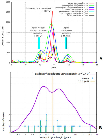 Scafetta [37,74] showed that the 11-year sunspot cycle is actually composed of three closely spaced frequencies. In fact, the presence of the two tidal frequencies with periods at about 10 and 12 years implies that the Schwabe cycle could be characterized by a primary spectral peak close to 11 years (which could be generated by the primary synchronization of the solar dynamo), surrounded by two minor spectral peaks at about 9.93 and 11.86 years, which correspond to and . This prediction is confirmed in Figure 6A, which shows several power spectra of different sunspot number records and suggests that the solar dynamo could be actually controlled by the neap–spring tide between Jupiter and Saturn and the tidal oscillation associated with Jupiter’s eccentric orbit, because the two frequencies appear at the left and the right side of the main 11-year spectral peak. The same result was obtained also by other authors, such as by Tan and Cheng [88].