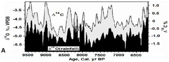 (4) Scafetta et al. [6] and Scafetta [7] specified that variations in solar activity on timescales ranging from multidecades to millennia are spectrally coherent with the orbital invariant inequalities generated by Jupiter, Saturn, Uranus, and Neptune. The orbital invariant inequalities are the beats among the planetary synodic cycles. In the differentially rotating Sun, these periodicities were shown to have mathematical features that could favor the setting of synchronized dynamics. The invariant inequality clusters have periods of 42–47, 55–65, 80–105 (the Gleissberg cycle), 160–185 (the Jose cycles), 200–240 (the Suess–de Vries cycles), 770–1160 (the Eddy cycle), and the Bray–Hallstatt cycle of 2000–2500 years [6,59]. The latter is accurately predicted by the invariant inequality produced by the beats between the synodic cycles of Saturn with Jupiter and Uranus and Neptune—the period being 2318 years. Figure 10 depicts the outcome. Figure 10A compares a solar () and a climate () record from 9500 and 6000 years ago (adapted from (Figure 5 in [34])). Figure 10B compares the orbital invariant inequalities of the solar system (red bars) determined by Scafetta [7], with the cross-spectral analysis peaks between the two records shown in Figure 10A. Finally, Figure 10C directly compares the invariant inequality oscillation (blue), whose phase is calculated by astronomical data only [7,110], with the (‰) record ([111], IntCal04.14c, black and red). In both cases, a perfect match between theoretical and experimental oscillations exists. These same cycles also emerge in the solar inertial motion [110,112,113,114]. The Bray–Hallstatt cycle of 2000–2500 years is observed in several solar [59,115,116] and climate records [6,117,118] as well. For example, the Greek Dark Ages (between 1000–550 B.C.) and the Little Ice Age (between about 1350–1850 A.D.) are well-established and historically confirmed colder periods of the Holocene, characterized by numerous historical climatic crises which occurred during the solar activity lows related to the Bray–Hallstatt cycle [116], as Figure 10C shows.