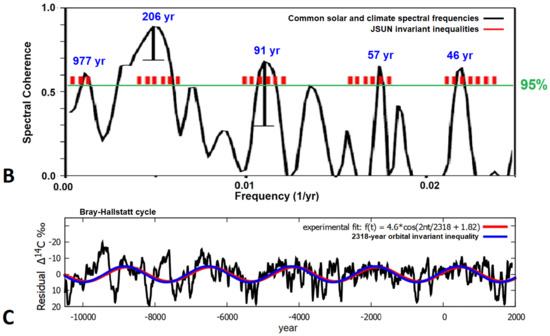 (A,B) Comparison between the cross-spectral analysis peaks between solar () and climate () records from 9500 and 6000 years BP (adapted from Figure 5 in [34]) versus the orbital invariant inequalities of the solar system (red bars) calculated in Scafetta [7]. (C) The Bray–Hallstatt 2318-year orbital invariant inequality oscillation (blue) versus the residual of the (‰) ([111], IntCal04.14c) record (black and red) [6,7].