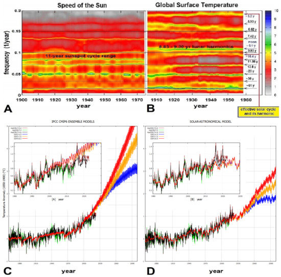 Figure 11A,B compare the time–frequency analyses between the HadCRUT3 global surface record [127] and the speed of the Sun relative to the center of mass of the solar system. As first observed by Scafetta [48], and later confirmed by sophisticated spectral coherence investigations [110,126], the observed changes in global surface temperatures mirror multiple astronomical cycles at the decadal and multidecadal scales. The Sun’s speed has major spectral peaks at periods of 5.93, 6.62, 7.42, 9.93, 11.86, 13.8, 20, and 60 years. The majority of them are connected to Jupiter and Saturn’s orbits. The temperature record has major spectral peaks at periods of about 5.93, 6.62, 7.42, 9.1, 10.4, 13.8, 20, and 60 years. Therefore, the majority of the climate oscillations appear to match the astronomical cycles, with the exception of the 9.1- and 10.4-year cycles. Scafetta [12,128] argued that the 9.1-year global surface temperature cycle is related to the lunar apsidal line rotation period of 8.85 years, the Saros eclipse cycle’s first harmonic of 9.0 years, and the soli-lunar nodal cycle’s first harmonic of 9.3 years [9,30,128,129]. The 10.4-year temperature cycle falls within the sunspot cycle frequency band and should represent the temperature signature of the 11-year solar cycle, because it is consistent with the variability of the solar cycle observed from 1900 (when it was longer) to 2000 (when it was shorter).
