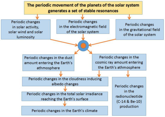 The hypothesis of the planetary origin of the 11-year sunspot cycle was first put forward when Wolf [27] suggested that “the fluctuations of spot-frequency rely on the influences of Venus, Earth, Jupiter, and Saturn”. A small number of scientists supported the planetary hypothesis of solar activity oscillations during the 20th century [28,29,30], but, during the last 15 years, this interest has grown significantly, leading to an increasing number of publications [31]. Recently, Scafetta and Bianchini [26] offered an extended review that was largely based on Scafetta’s prior work. The planetary origin of solar activity oscillations is not restricted to the 11-year solar cycle but includes all major solar oscillations on timescales ranging from monthly to multimillennial. Although the physical mechanisms explaining how the Sun may be modulating climate change are still debated (e.g., there are proposals of additional solar-related forcings [2,3] as well as of complex dynamical responses of the climate system to insolation variability [32,33]), the fact that the Earth’s temperature and the solar records display common oscillations throughout the Holocene has substantial implications for climate science [7,34,35,36,37,38,39,40,41,42,43,44,45]. Indeed, numerous criteria show that solar variability is driven by planetary beats that also affect a variety of terrestrial variables, including 14C and 10Be production, Earth’s rotation, ocean circulation, paleoclimate, geomagnetism, and so on [46].