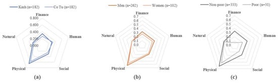 Our findings indicate that men in both Kinh and Co Tu households have higher HLSR scores than other groups, with statistically significant differences at the 1% level (Table 5). This suggests that women in any social group are at a disadvantage when it comes to recovering their livelihoods after climate shocks. Surprisingly, our results also show that menstruating women have a lower recovery index than the Co Tu ethnic group, with scores of 0.253 and 0.328, respectively. The largest difference between these two groups is in the physical capital index, with a difference of 0.175 units (Figure 3a). These findings suggest that Kinh women may face double pressure in managing household chores and adapting to climate change. Therefore, it is imperative to design disaster reduction programs that integrate gender issues, not just for women or ethnic minorities, to avoid social exclusion of these vulnerable groups.