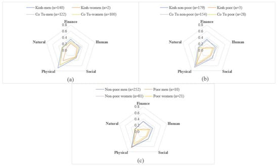 Spider chart of differences in livelihood resilience by (a) ethnicity, (b) sex, and (c) economic status.
