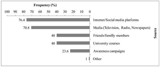 When asked about their sources of information about CC, the asked students reported that the internet/social media platforms (76.4%) and the media (70.8%) were their most used sources. Discussions with friends/family members (40%), university courses (40%), and awareness campaigns (23.6%) were also cited (Figure 1).