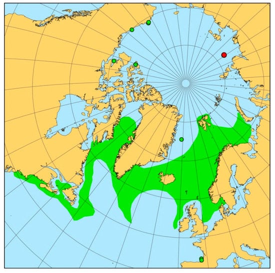Range of the northern wolffish Anarhichas denticulatus (green shading) and occasional records outside of the main range (green circles) according to [20], and a new record of the species in the Laptev Sea (red circle, our data).