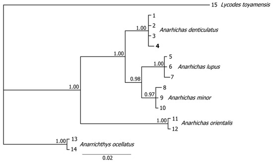 The results of genetic studies of the Anarhichadidae family representatives are few and have been performed using various genetic markers [50,66,67,68,69]. At the same time, most of the previous phylogenetic studies did not involve all five valid species of the family. An exception in this regard is the paper [67], in which all representatives of the family were analyzed using the control region of mtDNA (D-loop) and the nuclear gene ND1 as genetic markers.