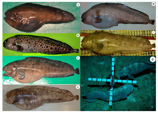 Specimens of the northern wolffish Anarhichas denticulatus: (a,c,d) caught by bottom trawl in Greenland waters in 2013 onboard R/V “Paamiut” 11.4, 55.8 and ~98 cm long, respectively (photos by A.M. Orlov, photographed just after capture); (b) specimen 39.3 cm long from the Laptev Sea (photo by A.M. Orlov, photographed just after capture); (e,f) caught by fish trap during 2004 MAR-ECO cruise on board R/V “G.O. Sars” off the Mid-Atlantic Ridge weighed 18.3 kg and ~30 kg, respectively (photos from MAR-ECO project archive, photographed just after capture); (g) photographed underwater by “ROBIO” lander ~100 cm long (photo courtesy Oceanlab, the University of Aberdeen, Scotland).