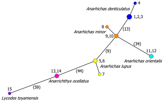 Phylogenetic relationships of the Anarhichadidae family by COI mtDNA sequences. Numbers indicate specimens (see Table 1 for explanation), numbers of substitutions are given in parentheses, and the size of circles corresponds to the number of specimens.