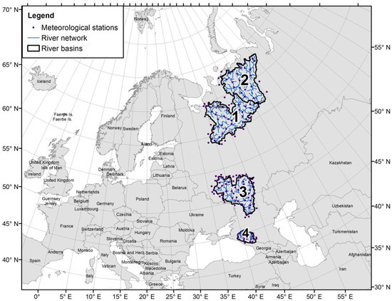 Location of the studied river basins: 1: Northern Dvina—Ust-Pinega, 2: Pechora—Oksino, 3: Don—Belyaevsky, 4: Kuban—above the Krasnodar reservoir.