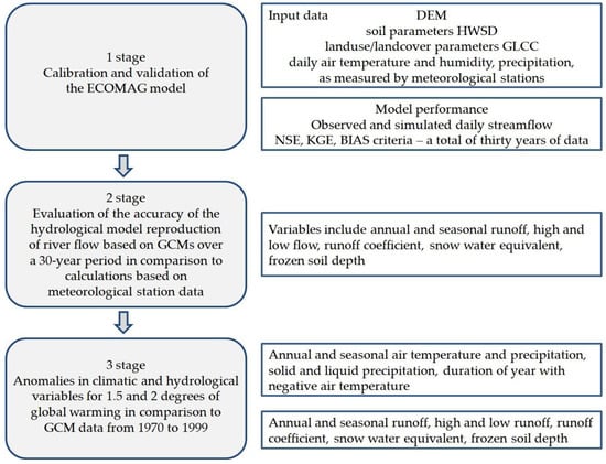 Methods for assessing changes in the water regime of large rivers using physically based spatially distributed hydrological models and GCMs have been developed in recent years [,,]. When solving the tasks of long-term forecasting of water regime changes, the application of hydrological models of this class operating on a daily time step allows for sufficient detail assessment of the physical mechanisms of river basin response to climatic impacts, taking into account regional characteristics and reducing uncertainties of river flow change estimates.