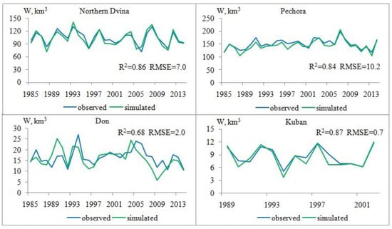 Dynamics of the simulated and observed annual flow of the Northern Dvina, Pechora, Don for the period 1985–2014 and Kuban for the period 1989–2002.