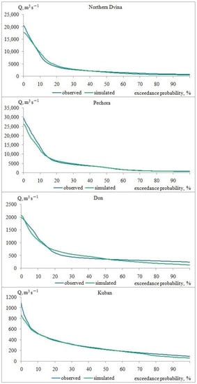 Flow duration curves of the observed and simulated daily runoff of the Northern Dvina, Pechora, Don and Kuban rivers.