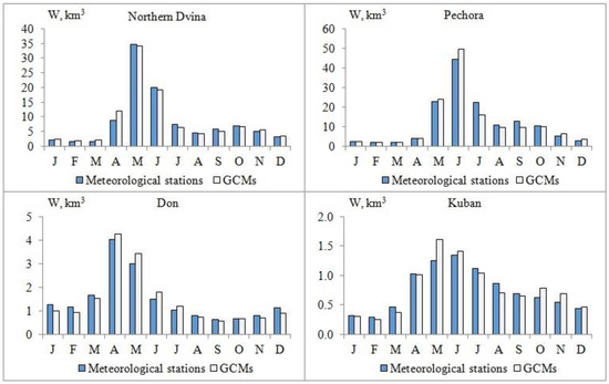 The possibilities of reproducing annual and seasonal river runoff for the baseline period of 1970–1999 were investigated using flow formation models and GCMs grid data to calculate the ensemble of multiyear hydrographs of daily runoff. Annual and seasonal flow rates, high (Q10—probability of exceeding 10% days per year) and low (Q90—probability of exceeding 90% days per year) runoff (based on flow duration curves), and runoff coefficient were calculated from GCMs data and were compared to those obtained earlier by modeling from meteorological station observations. The division of runoff by season was as follows: winter runoff of the Northern Dvina, Don, and Kuban from November to March, and of the Pechora from November to April; spring flood of the Northern Dvina from April to June, of the Pechora from May to June, and of the Don and Kuban from April to May; summer and autumn runoff of the Northern Dvina and Pechora from July to October, and of the Don and Kuban from June to October. Furthermore, the modeling results were used to compare calculations of runoff-forming factors such as snow water equivalent and the depth of seasonal freezing of soils on average for the basin based on data from meteorological stations and GCMs.