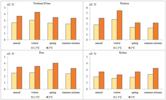 According to our calculations, the rate of rising air temperature in general increases from the south to the north of European Russia as a result of global warming. The estimated increase in mean annual air temperature in the Northern Dvina and Pechora basins under 1.5 °C global warming would be 2.8 °C, in the Don basin 2.5 °C, and in the Kuban basin 1.9 °C compared to the baseline period of 1970–1999 (Figure 6). The estimated increase in mean annual air temperature in the Pechora basin under 2 °C global warming would be 4.1 °C, in the Northern Dvina basin 3.7 °C, in the Don basin 3.4 °C, and in the Kuban basin 2.7 °C. To compare the several river basins, the seasons were divided as follows: winter from November to March, spring from April to May, and summer–autumn from June to October. At the same time, the Northern Dvina and Pechora basins would show the greatest estimated rate of warming during winter, by 3.1–4.3 and 3.8–5.5 °C, respectively, the Don for spring, by 3–4 and 3.6–4.8 °C, and the Kuban for summer–autumn, by 2.3–3.2 °C. An increase in global air temperature of 1.5 to 2 °C would cause estimated additional warming in the studied river basins by 0.8–1.3 °C per year and by 0.6–1.7 °C by season.
