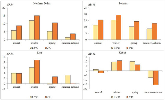 Estimated annual precipitation would increase by 11–15% for the Pechora, 4–8% for the Don and Northern Dvina, and close to zero for the Kuban (Figure 7). The greatest increase in estimated precipitation would occur during the winter season in each river basin, ranging from 6–9% on the Don to 15–19% on the Pechora. The estimated relative increase in summer–autumn precipitation in the Pechora basin would be 9–13%, 4% in the Northern Dvina and Don basins, and 8–16% in the Kuban basin. An increase in global air temperature from 1.5 to 2 °C would cause estimated additional moistening of the Northern Dvina and Pechora basins by 3–4.5% but decreased moistening of the Kuban basin by 4% due to the warm season and almost no change in the Don basin.