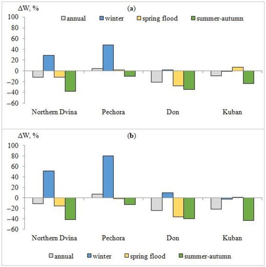 The assessment of flow anomalies in European Russia revealed the following general features: winter runoff of arctic rivers would increase, spring melt runoff of the Northern Dvina and Don would decrease, and summer–autumn runoff of all studied rivers would decrease to varying degrees. The change in annual flow of the Pechora river would be positive, while the change in flow of the Northern Dvina, Don, and Kuban rivers would be negative. Given the current process of natural regulation of the flow of rivers in European Russia’s forest zone [] and its predicted strengthening in the future for all of the studied rivers except for the Pechora, there will be an additional need to adapt the current rules of flow regulation by the Tsimlyansk and Krasnodar reservoirs in the Don and Kuban basins. Water resources will become increasingly scarce in the Don and Kuban basins. The further direction of refinement of the obtained results of the global warming impact on water regime changes in European Russia river basins could be the use of meteorological projections from the CMIP6 and land use dynamics during the 21st century.