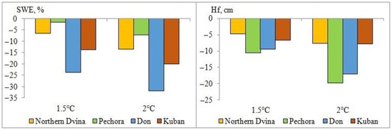 Under 1.5 and 2 °C global warming, the average maximum snow water equivalent is estimated to decrease by 24–32% in the Don basin, 14–20% in the Kuban basin, 7–14% in the Northern Dvina basin, and 2–7% in the Pechora basin (Figure 9). The average depth of seasonal freezing of soils would decrease by 10 cm in the Northern Dvina and Kuban basins and by 10–20 cm in the Pechora and Don basins as a result of warming.