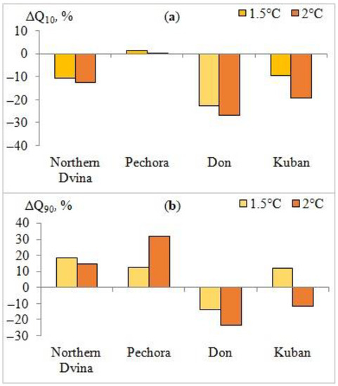 In general, with a 1.5 to 2 °C global warming, the values of the relative change in annual flow of rivers in European Russia increase from north to south and from east to west, indicating that hydrological systems in milder climates were more sensitive to changes in meteorological characteristics. The most negative runoff anomalies are characterized in the southwestern part of the Northern Dvina basin, the middle part of the Don basin, and the lowland part of the Kuban basin, whereas positive runoff anomalies are characterized in the northern and eastern parts of the Pechora basin.