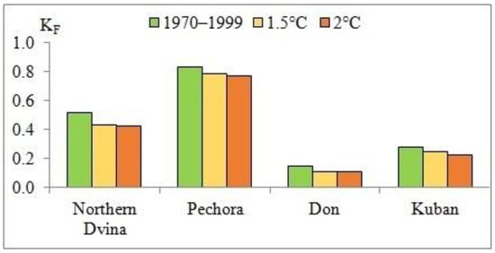 Runoff coefficient (KF) of the Northern Dvina, Pechora, Don, and Kuban rivers for the baseline period 1970–1999 and under global warming of 1.5 and 2 °C in the 21st century.