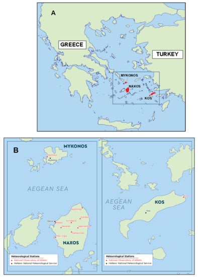 (A) The location of the three islands (Mykonos, Naxos, and Kos); (B) the positions of the meteorological stations used in the present study.