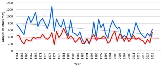 Annual rainfall trends of the Naxos (red solid and dotted lines) and Kos (blue solid and dotted lines) meteorological stations for the period of 1961–2019.
