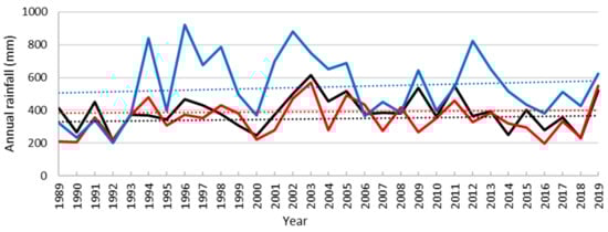 Annual rainfall trends of the research meteorological stations during 1989–2019. Mykonos (black solid and dotted lines), Naxos (red solid and dotted lines), and Kos (blue solid and dotted lines).