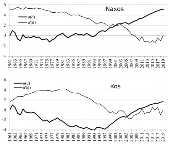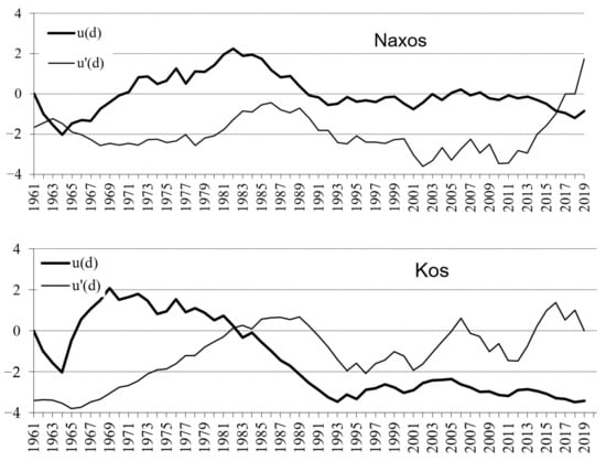 The Mann–Kendall trend analysis was used to investigate abrupt or non-climatic change in mean annual air temperatures, as well as whether this change is statistically significant (when the normal curve exits the confidence interval) for a 95% significance level. Figure 8 and Figure 9 show the findings of this research. Figure 8 demonstrates abrupt temperature increases, while during the observation period of 1961–2019 (for the Naxos and Kos MSs) the upward trends are statistically significant (95% sig. level). The change starts from the year 2001 for the Naxos station (upward trend) and for the Kos station (upward trend) in the year 2005.