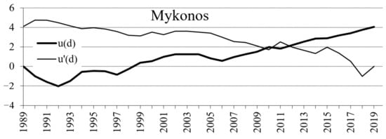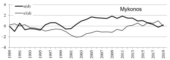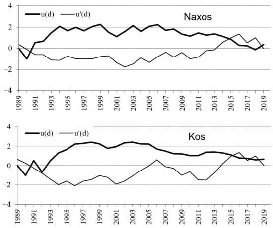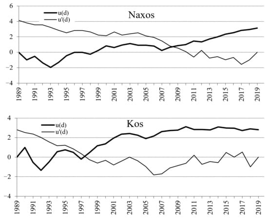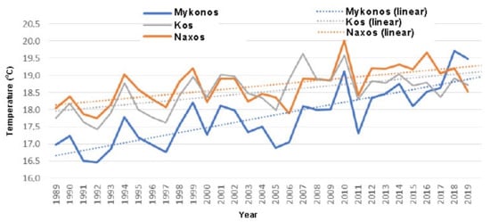The Mann–Kendall trend test was also applied for the common observation period 1989–2019 concerning the 3 MSs of the research area. The results of the analysis can be observed in the following Figure 9. According to this figure, an upward trend can be observed in the data of all MSs, and the change starts from the year 2010 for the MS of Mykonos, the year 2008 for the MS of Naxos, and the year 1997 for the MS of Kos, respectively. These changes were found to be statistically significant (95% sig. level) for all 3 MSs. Several studies in the Mediterranean region have also revealed a statistically significant increase in air temperature in recent decades [41,75,76,78,79].