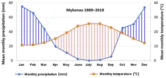 Bagnouls and Gaussen ombro-thermal diagram. Distribution of monthly precipitation and temperature in Mykonos island. Red dotted lines indicate the dry-thermal period and blue vertical lines indicate the wet period.