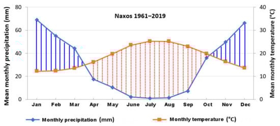 Bagnouls and Gaussen ombro-thermal diagrams. Distribution of monthly precipitation and temperature in Naxos island. Red dotted lines indicate the dry-thermal period and blue vertical lines indicate the wet period.