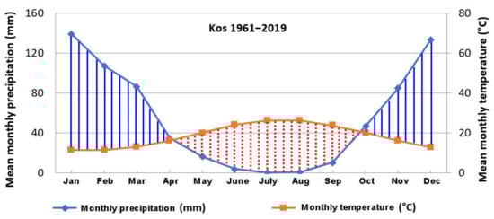 Bagnouls and Gaussen ombro-thermal diagram. Distribution of monthly precipitation and temperature in Kos island. Red dotted lines indicate the dry-thermal period and blue vertical lines indicate the wet period.