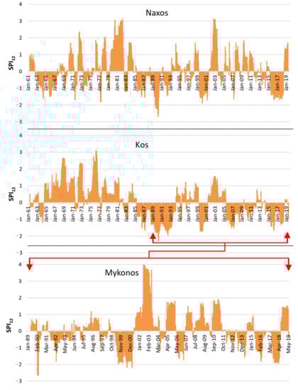 In the period of 2006–2007, Mykonos experienced a drought of 7 months, Naxos for 2 months, and Kos for a longer period (22 months). Finally, in the period from August 2015, Naxos faced a continuous drought of 36 months, while Mykonos during the same period presented 2 droughts of 10 months and Kos experienced 2 episodes of drought of 12 and 10 months, respectively.
