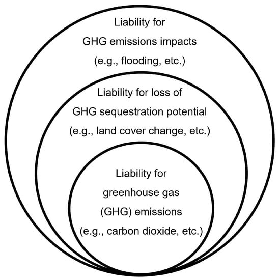 The present study hypothesizes that liability is a responsibility for climate change from GHG emissions, which can be elucidated, quantified, and valued based on the social cost of emissions (e.g., the social cost of CO2 emissions, SC-CO2, etc.). Land conversion causes GHG emissions from land development as well as any future loss of soil C sequestration potential because of the consequences of land development (e.g., buildings, impervious areas, etc.). Liability for these emissions and the subsequent climate change L&D can be divided among various responsible parties, including the administrative entities that create regulations and permit development, the developers that cause the land conversion and GHG emissions, and the consumers who purchase the developed property. Partial liability from GHG emissions can be quantified and valued as SC-CO2 at a fixed rate of $46 per metric ton of CO2 [12], which can be potentially used to help assign liability for climate change impacts. The fixed cost of SC-CO2, in many cases, will not compensate for the actual market-based costs of L&D for which liability will need to be assigned. Additionally, there are non-economic liabilities (e.g., trauma, loss of culture, etc.), as well as reduced future sequestration potential of developed lands. Assigning this liability has added complexity because, while attributing GHG emissions is possible (and demonstrated in this research), linking specific climate L&D events to individual GHG emissions is an emerging science; however, feedback mechanisms are necessary to change behavior that results in GHG emissions. Assignment of liability may be necessary to create new legal frameworks to change behavior that leads to climate change as well as create funding mechanisms for L&D compensation. There are various techniques to attribute and estimate liability across different geographic extents, time periods, and entities, which we will discuss in this paper.