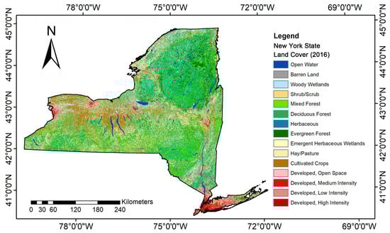 Land cover map of New York State (USA) for 2016 (40°30′ N to 45°1′ N; 71°51′ W to 79°46′ W) (based on data from MRLC [15]).